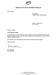 国际自行车联盟感谢信(英文)