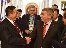 中国自行车运动协会主席崔大林向国际奥委会主席巴赫介绍 星空·体育瑞豹自行车